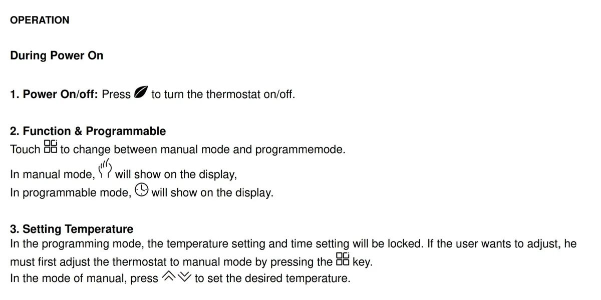 - Stel de verwarming in op handmatig (het handje) en stel de gewenste temperatuur in.